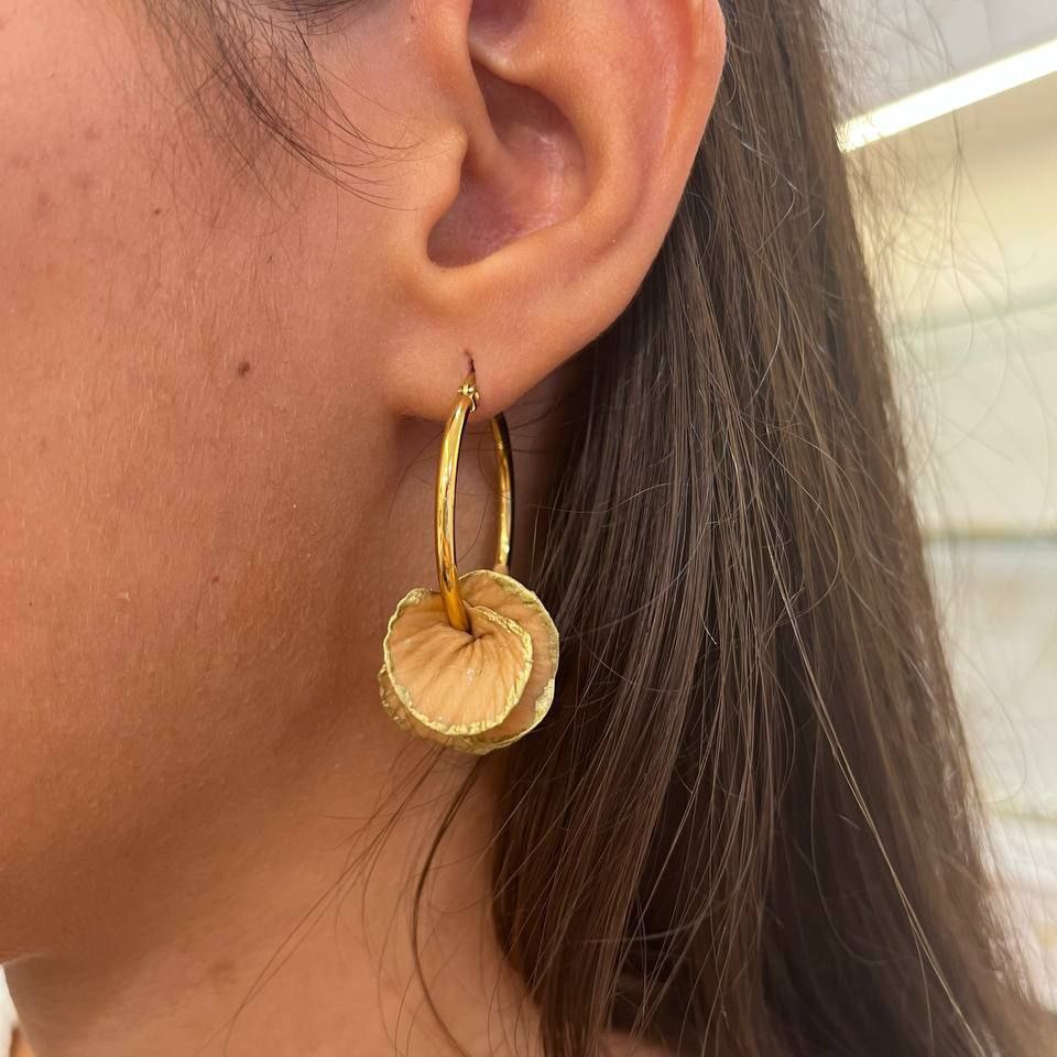 Con 2 pétalos enroscados en un aro de 2.5 cm. bañado en oro de 18 kl.
