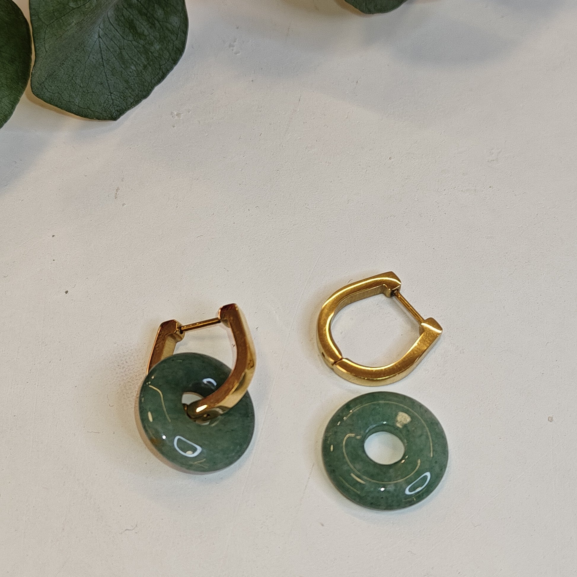 Arito de 1,5 cm de acero chapado en oro de 14 kl. con colgante de cuarzo aventurina de 2 cm . Un toque de lujo para el día a día.